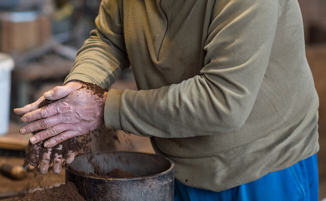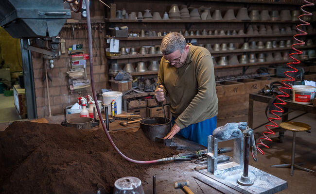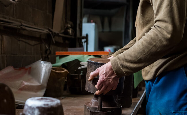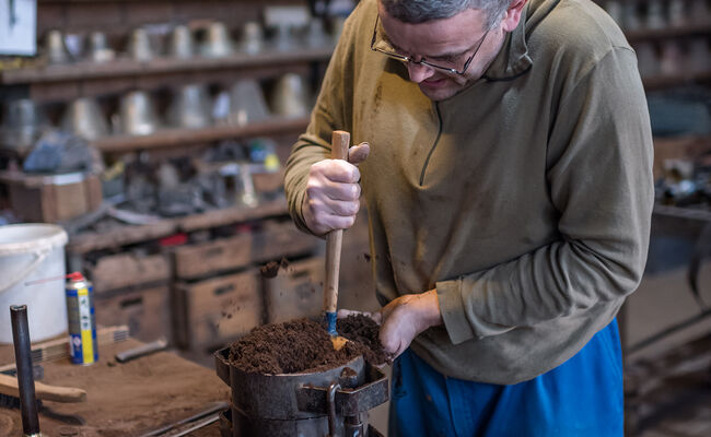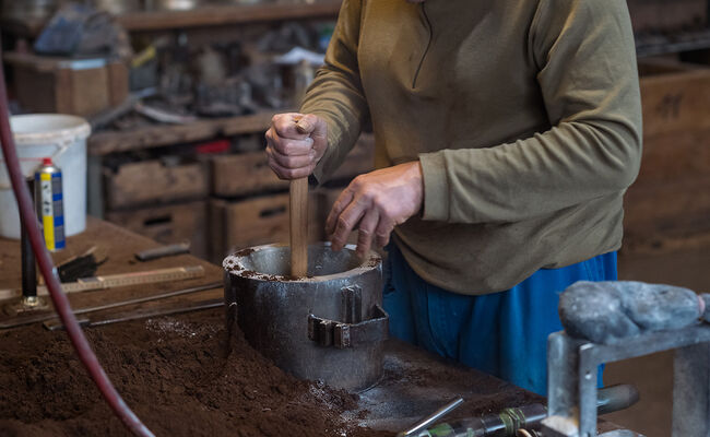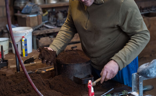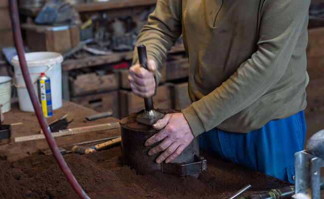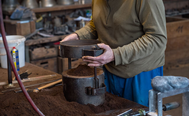 Nachdem Sie sich ein Glockenmodell entschieden haben, formen wir dieses in unserem Geschäft mit einem Quarzhaltigen Natursand. Der Sand wird ohne Chemie und ausschließlich mit Wasser aufbereitet. Je nach Modell wird passend der zweiteilige Formkasten ausgesucht und mit Talkum bestäubt, damit der feuchte Sand am Modell nicht haften bleibt. Im nächsten Arbeitsschritt geben wir den grösseren Teil des Formkasten über das Modell und füllen es Stück für Stück mit Sand auf. Fast zuoberst angekommen wird in die Aussparung im Modell der Lätsch eigesetzt, an diesem später der gewünschte Riemen angebunden werden kann.