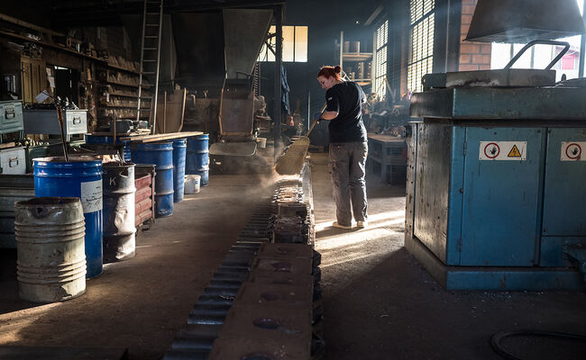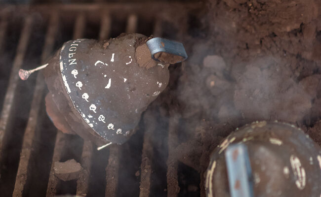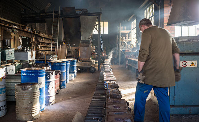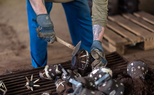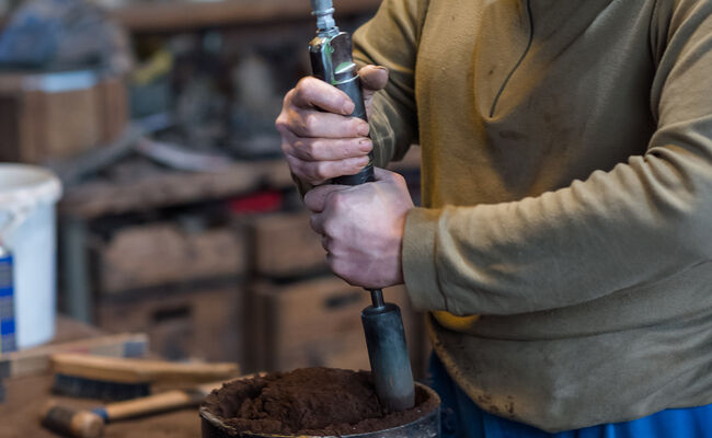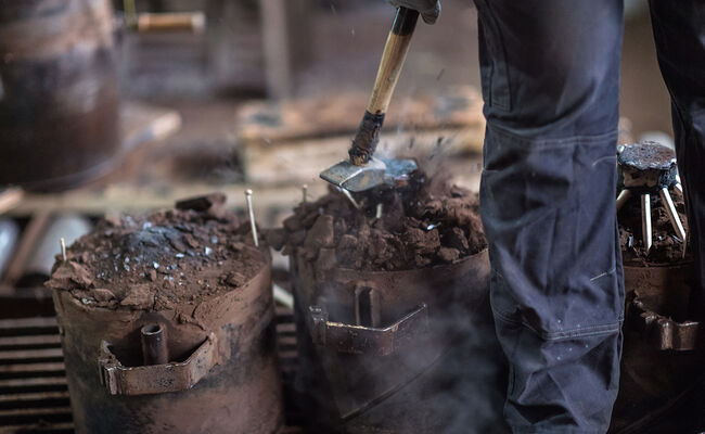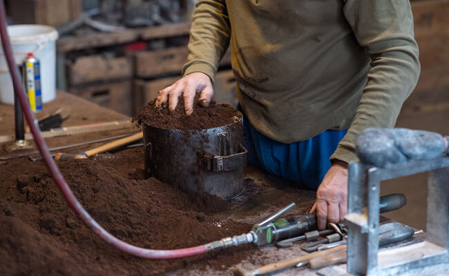 Nun ist der Moment gekommen, an dem wir die fertige Glocke aus der Sandform lösen und die Einguss-Kanäle abschlagen. Jede Sandform kann nur einmal benützt werden, da sie beim Auspacken zerstört wird. Im nächsten Arbeitsschritt werden die Überreste der Einguss-Löcher abgestochen, die Kante geschliffen und die Glocke zum Sandstrahlen weiter gereicht.