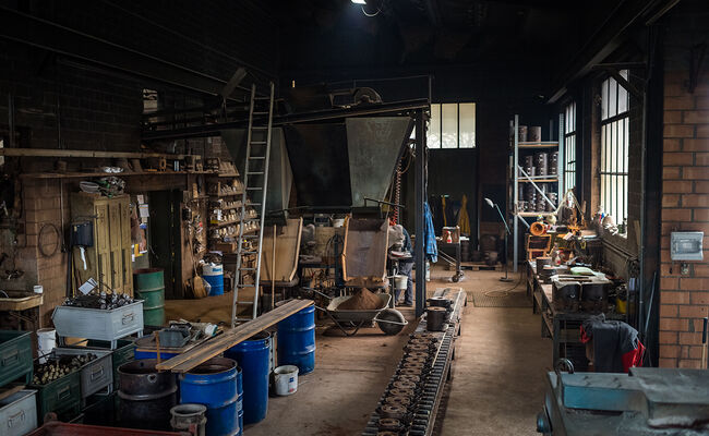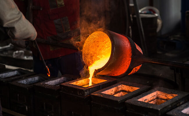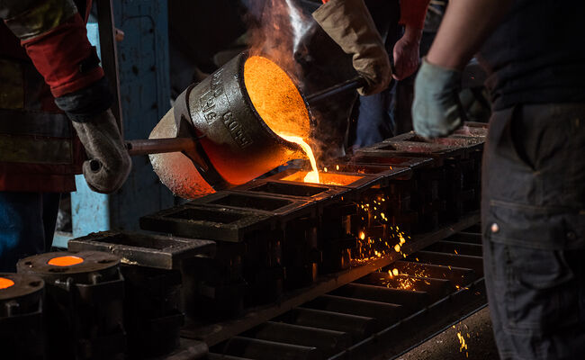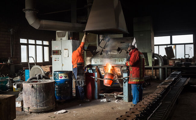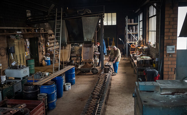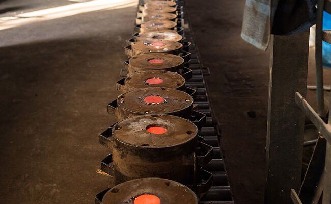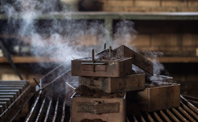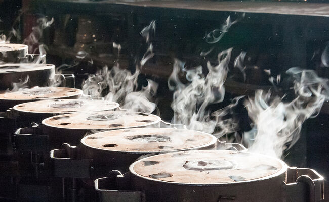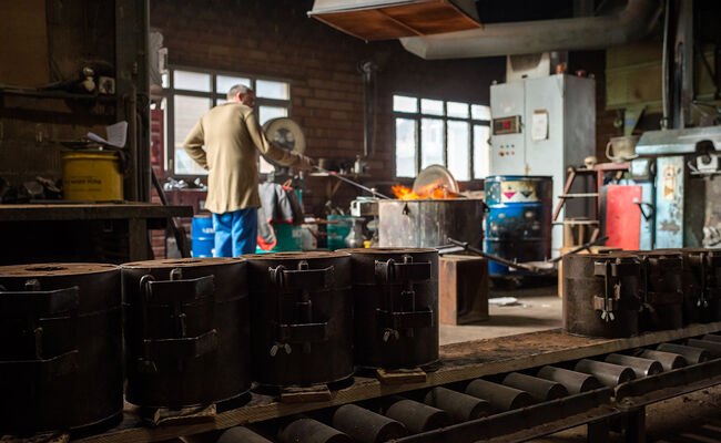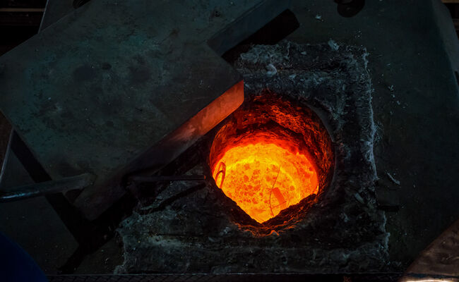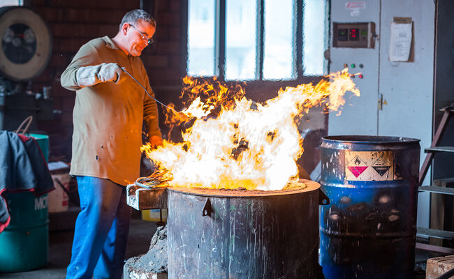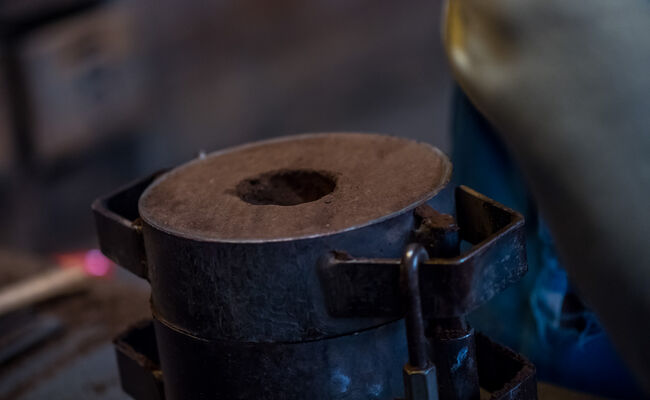 In aller Frühe wird unser Schmelzofen angefeuert, damit die Glockenspeise, die aus 80 % Kupfer und 20 % Zinn besteht, schmilzt. Hat die Glockenspeise eine Temperatur von zirka 1280 Grad Celsius erreicht, kann der Guss beginnen. Danach muss die Glocke etwa 15 bis 20 Minuten auskühlen. Während dieser Zeit wird der Schmelzofen wieder mit Kupfer gefüllt, um die Restwärme zu nutzen.