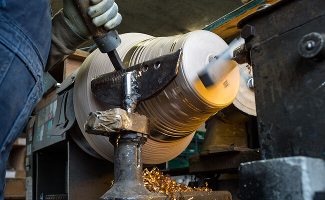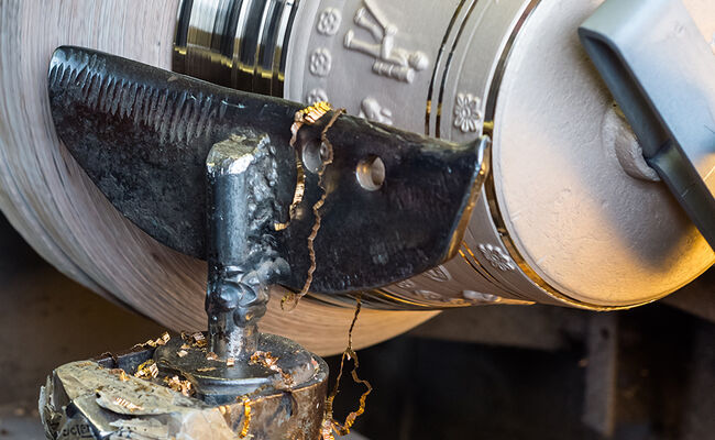 Beim Abdrehen der Glocke wird mit einer Wasserwaage und viel Fingerspitzengefühl der Lätsch gerichtet. Vor dem Abdrehen werden die Wappen und die Beschriftung geschliffen, damit diese schön glänzen. Danach wird die Glocke in die Drehbank eingespannt und mit einer feinen Stahlbürste poliert. Um den wunderschönen Glanz zu erhalten, wird im nächsten Arbeitsschritt in den vorhergesehenen Rillen die Glocke abgedreht. Sobald die Glocke fertig abgedreht ist, wird der passende Kallen ausgesucht und eingesetzt. Die Kallen werden auch bei uns im Haus zweimal im Jahr aus Messing gegossen.