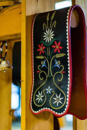 Ø ca. 240 mm mit rot / weiss eingefasstem Riemen 12 cm mit Messing Schnalle und gesticktem Blumen Dekor